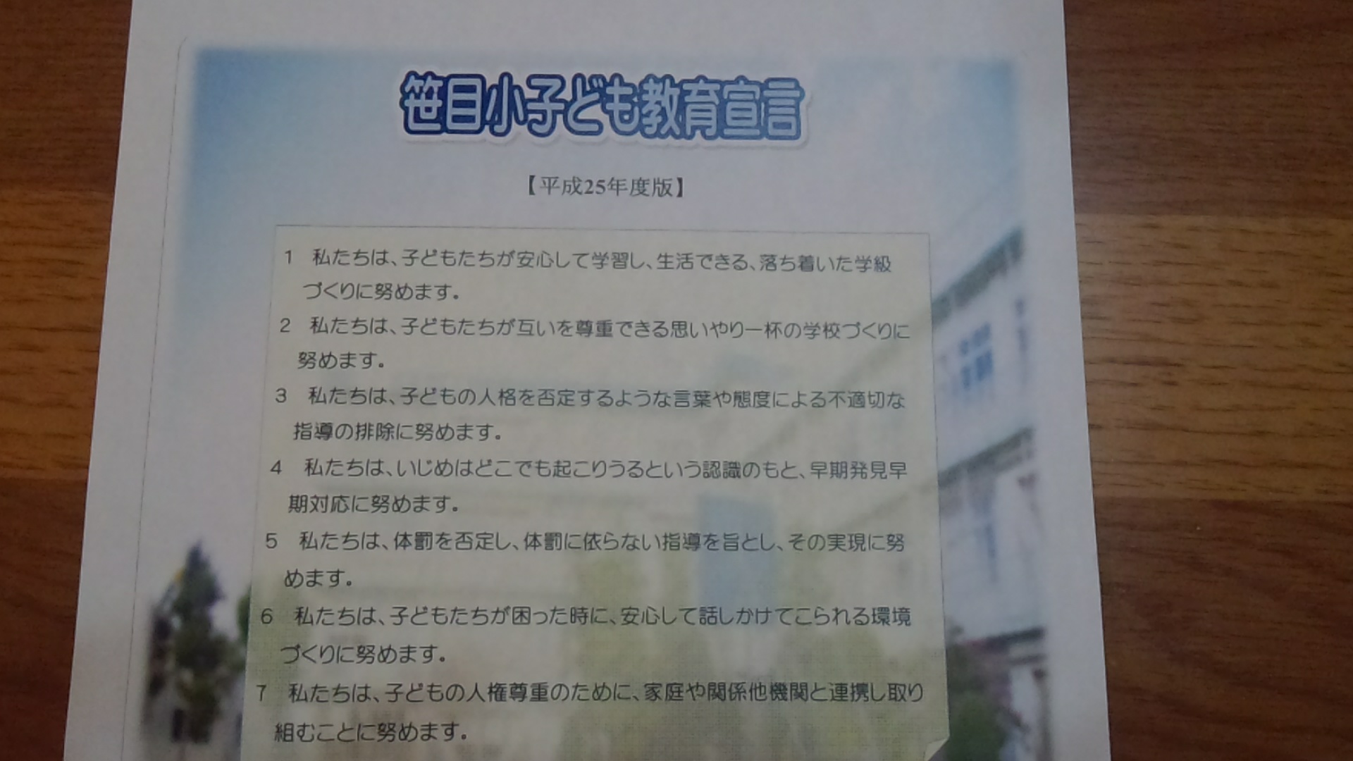 「笹目小子ども教育宣言」。教員、保護者に対して発信しています。