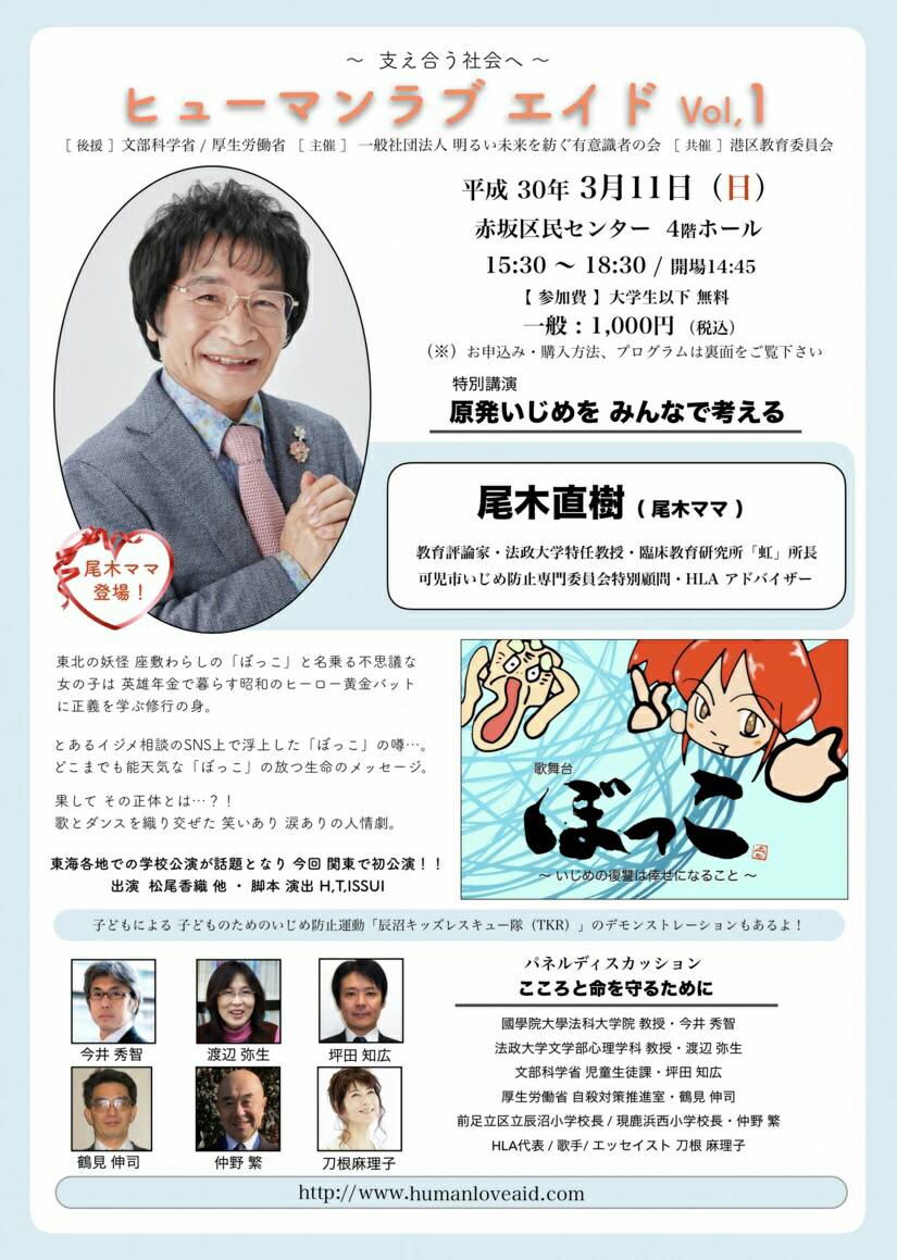 日ごろから、教育分野でご教授いただいている前足立区立辰沼小学校校長仲野繁先生が立ち上げられた「いじめ防止教育」、ヒューマンラブエイドの栄えある第一回目の公演です。