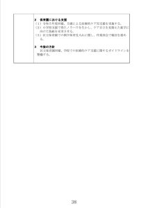 続けて、38ページ、項番2でございます。保育園における支援でございます。(3)にございますとおり、区立保育園での朝夕保育の受入れに関しまして、作業部会で検討を進めてまいります。 最後に、項番3、今後の方針でございます。学校での医療的ケア支援に関するガイドラインを整備してまいります。