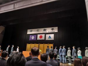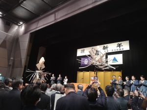 区役所庁舎ホールでは、区長はじめ、区の職員、議員、区政に貢献をしてくださっている大勢の区民の皆さまが集りました。木遣りの掛け声と共に新年名刺交換会は盛大に開催されました。いつ見ても見事な木遣りです。