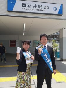 街宣車で西新井栄町〜関原〜西新井本町〜本木〜扇野〜江北地域を街宣しました。